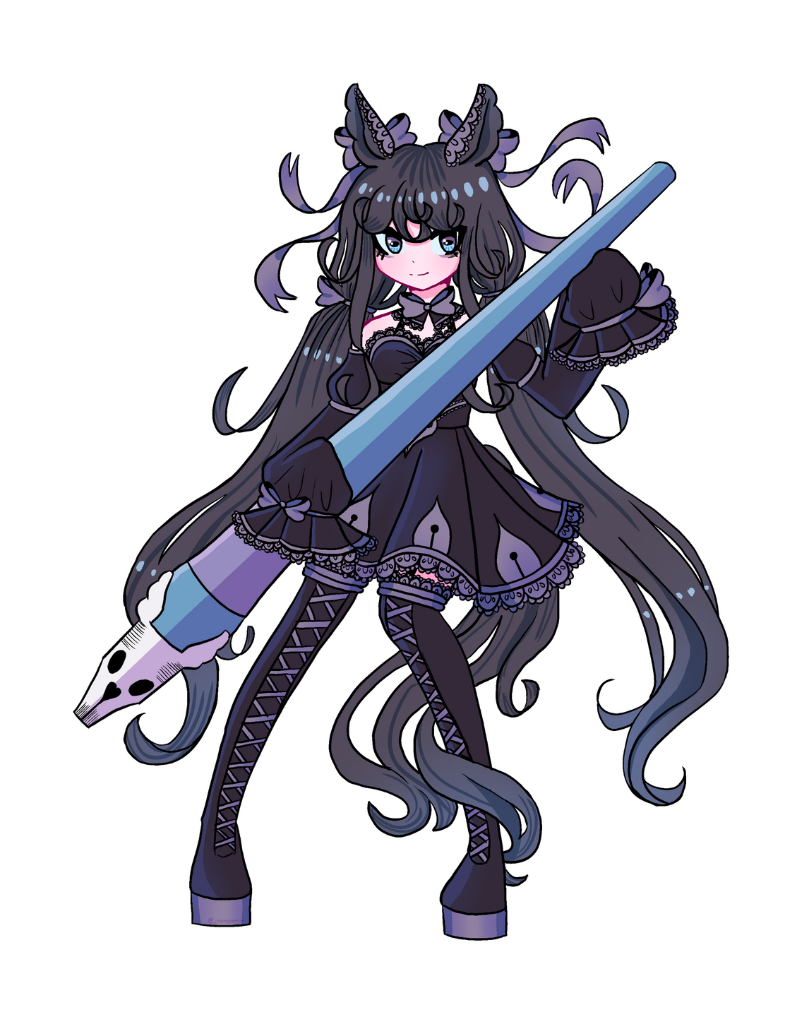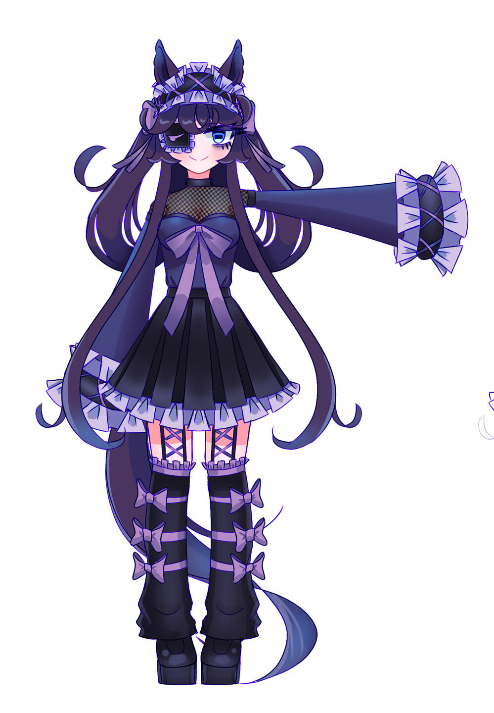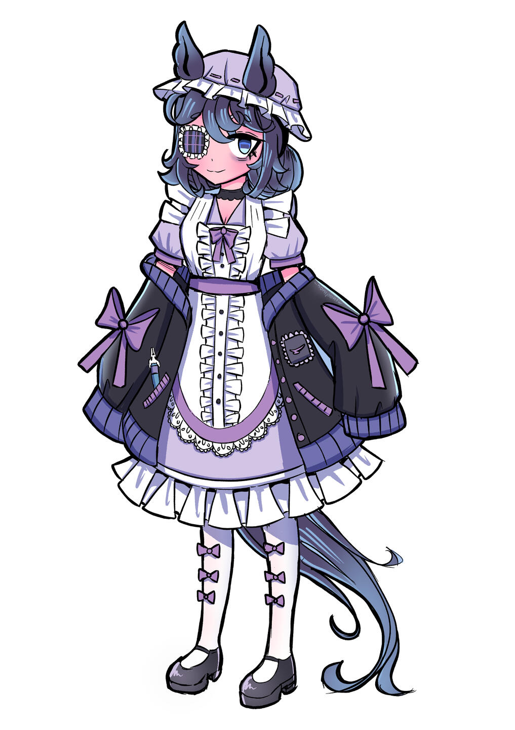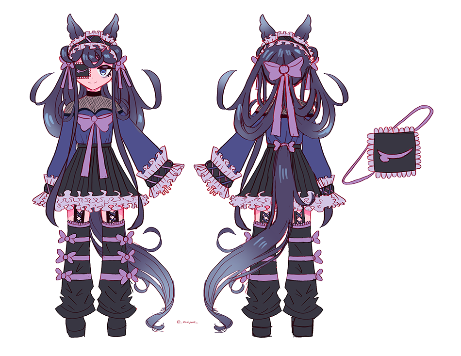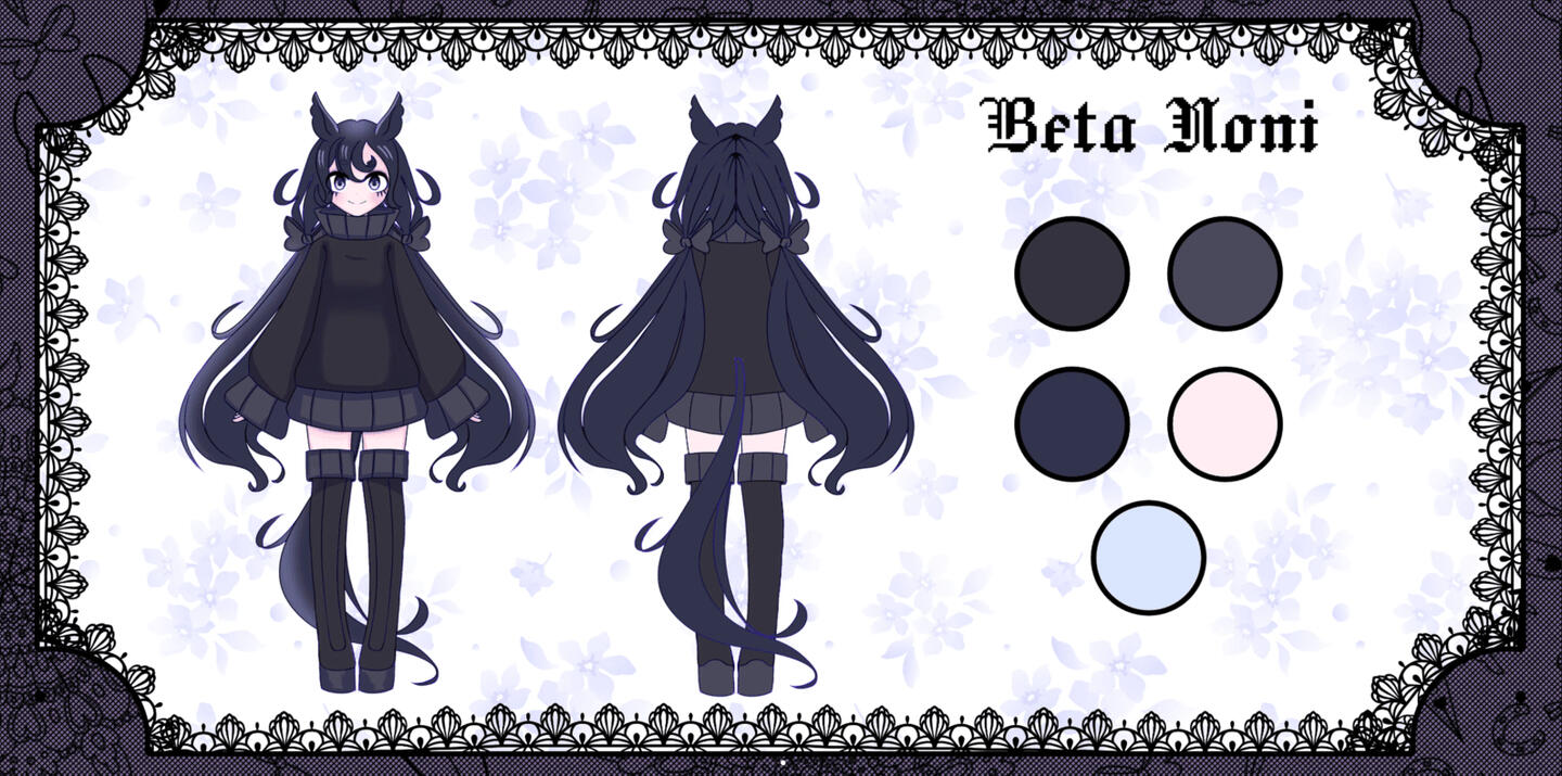 A horse girl who tries to look cool, but slips up a lot because she is a very sleepy horse. Noni tends to stay up all night drawing characters in Victorian and lolita dresses, but gets her clothes covered in ink because of this, hence why she usually wears a lot of dark clothing. She especially loves wearing things that are oversized, hoodies, and Gothic Lolita type clothing because it makes her feel cute.Many describe her voice as monotone but she usually interrupts herself with her yawns hence making her forget what she was just talking about. Her hobbies also include collecting fountain pens, going to museums, admiring lacework, scrolling art forums, and drawing. Her favorite art tool is a dip pen + ink but she will spend time learning how to use different art mediums for fun.She doesn't exist in the Uma Musume universe, but if she did, she would probably be pals with Daiichi Ruby and enjoy dressing her up.